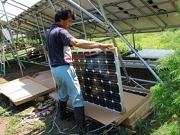 180Wの大きいパネルは横12枚で2列に設置しました。さらに6枚は、3列目に設置しましたが、取付位置が高いために足場を 組んで行いました。M55のパネル12枚ははしごで取付ました。