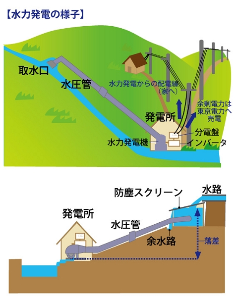 例えば、普通の住宅1軒の電力をまかなうには約1kWの電力が必要ですが、その電力を水力発電で発電するには、発電効率を60%として計算すると毎秒40リットルの水量と5mの落差が必要になります。したがってかなりの水の流れが必要になります。